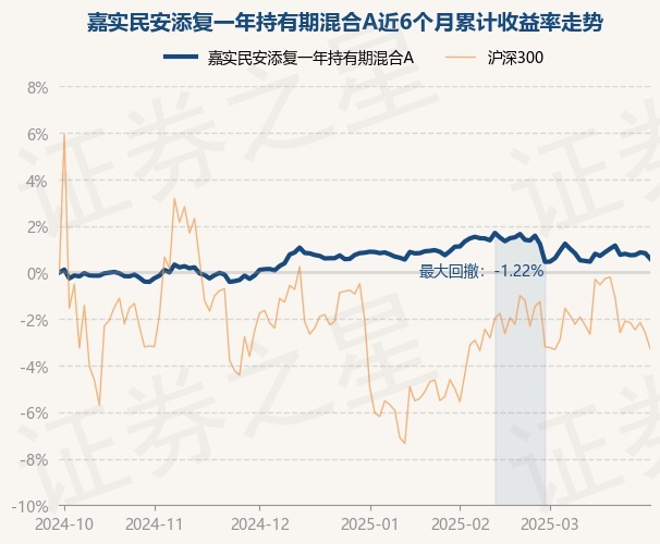 证券之星消息,3月31日,嘉实民安添复一年持有期混合A最新单位净值为1.0192元,累计净值为1.0192元,较前一交易日下跌0.23%。历史数据显示该基金近1个月上涨0.14%,近3个月下跌0.25%,近6个月上涨0.59%,近1年上涨0.19%。该基金近6个月的累计收益率走势如下图: