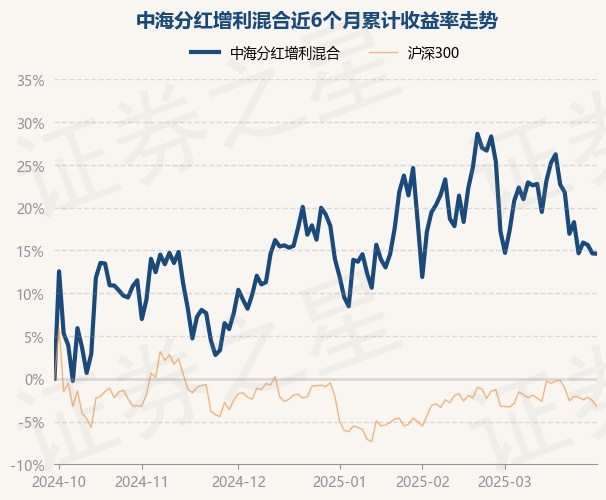 证券之星消息,3月31日,中海分红增利混合最新单位净值为0.6637元,累计净值为2.4117元,较前一交易日下跌0.03%。历史数据显示该基金近1个月下跌2.25%,近3个月上涨0.55%,近6个月上涨14.61%,近1年上涨9.94%。该基金近6个月的累计收益率走势如下图: