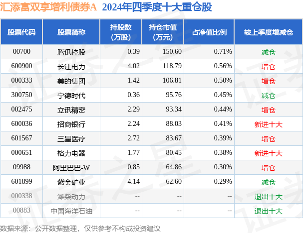 汇添富双享增利债券A为债券型-混合二级基金,根据最新一期基金季报显示,该基金资产配置:股票占净值比10.46%,债券占净值比108.47%,现金占净值比3.28%。基金十大重仓股如下: