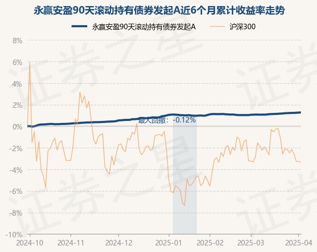 证券之星消息,3月31日,永赢安盈90天滚动持有债券发起A最新单位净值为1.1092元,累计净值为1.1092元,较前一交易日上涨0.02%。历史数据显示该基金近1个月上涨0.22%,近3个月上涨0.25%,近6个月上涨1.25%,近1年上涨2.55%。该基金近6个月的累计收益率走势如下图: