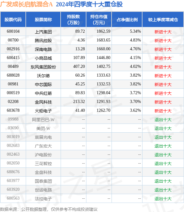 广发成长启航混合A为混合型-偏股基金,根据最新一期基金季报显示,该基金资产配置:股票占净值比93.31%,无债券类资产,现金占净值比10.01%。基金十大重仓股如下: