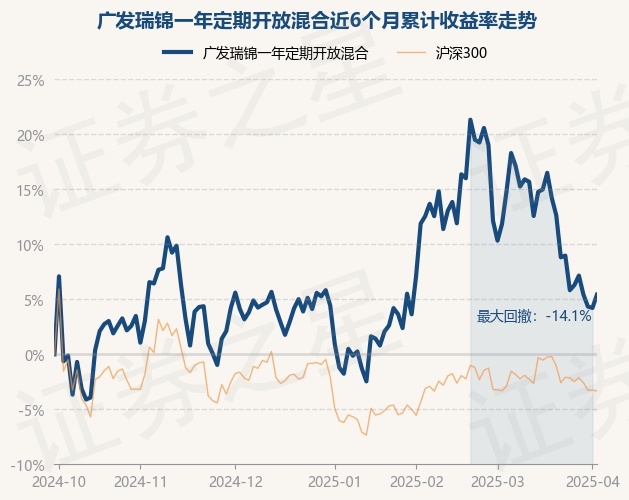 证券之星消息,3月31日,广发瑞锦一年定期开放混合最新单位净值为0.6141元,累计净值为0.6141元,较前一交易日下跌1.05%。历史数据显示该基金近1个月下跌6.97%,近3个月下跌0.08%,近6个月上涨4.33%,近1年上涨11.25%。该基金近6个月的累计收益率走势如下图: