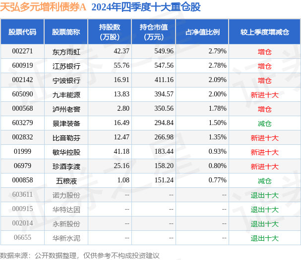 天弘多元增利债券A为债券型-混合二级基金,根据最新一期基金季报显示,该基金资产配置:股票占净值比20.61%,债券占净值比97.68%,现金占净值比1.49%。基金十大重仓股如下: