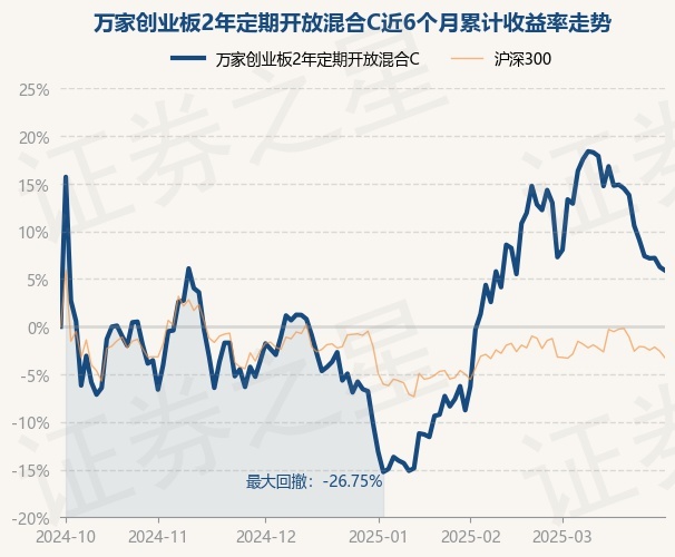 证券之星消息,3月31日,万家创业板2年定期开放混合C最新单位净值为0.6859元,累计净值为0.6859元,较前一交易日下跌0.33%。历史数据显示该基金近1个月下跌1.3%,近3个月上涨17.85%,近6个月上涨5.9%,近1年上涨10.42%。该基金近6个月的累计收益率走势如下图: