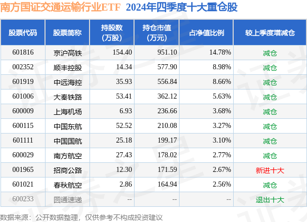 南方国证交通运输行业ETF为指数型-股票基金,根据最新一期基金季报显示,该基金资产配置:股票占净值比99.89%,无债券类资产,现金占净值比0.49%。基金十大重仓股如下: