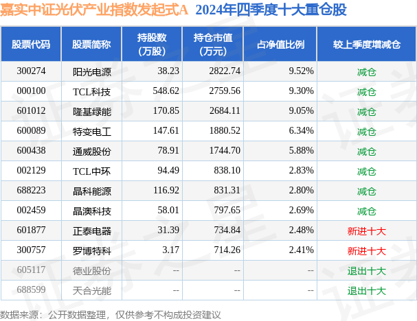 嘉实中证光伏产业指数发起式A为指数型-股票基金,根据最新一期基金季报显示,该基金资产配置:股票占净值比94.58%,无债券类资产,现金占净值比6.35%。基金十大重仓股如下: