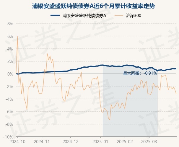 证券之星消息,3月31日,浦银安盛盛跃纯债债券A最新单位净值为1.0493元,累计净值为1.3175元,较前一交易日上涨0.05%。历史数据显示该基金近1个月上涨0.0%,近3个月下跌0.44%,近6个月上涨0.81%,近1年上涨1.77%。该基金近6个月的累计收益率走势如下图: