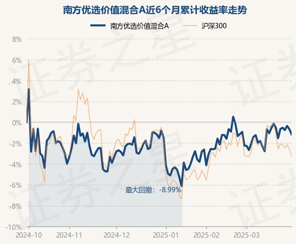 证券之星消息,3月31日,南方优选价值混合A最新单位净值为0.9031元,累计净值为3.4361元,较前一交易日下跌0.5%。历史数据显示该基金近1个月上涨1.11%,近3个月上涨0.36%,近6个月下跌1.16%,近1年上涨8.81%。该基金近6个月的累计收益率走势如下图: