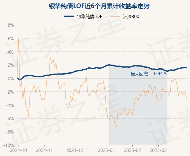 证券之星消息,3月31日,银华纯债LOF最新单位净值为1.1438元,累计净值为1.6508元,较前一交易日上涨0.02%。历史数据显示该基金近1个月上涨0.28%,近3个月下跌0.17%,近6个月上涨1.58%,近1年上涨3.13%。该基金近6个月的累计收益率走势如下图: