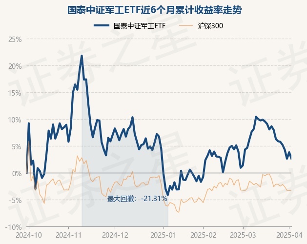 证券之星消息,4月1日,国泰中证军工ETF最新单位净值为1.0344元,累计净值为1.0344元,较前一交易日上涨1.17%。历史数据显示该基金近1个月上涨2.86%,近3个月下跌0.7%,近6个月上涨3.84%,近1年上涨13.66%。该基金近6个月的累计收益率走势如下图: