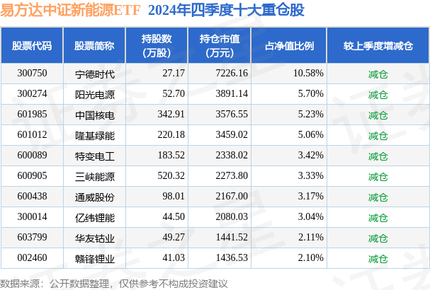 易方达中证新能源ETF为指数型-股票基金,根据最新一期基金季报显示,该基金资产配置:股票占净值比99.03%,无债券类资产,现金占净值比1.0%。基金十大重仓股如下: