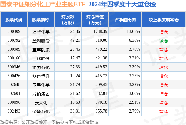 国泰中证细分化工产业主题ETF为指数型-股票基金,根据最新一期基金季报显示,该基金资产配置:股票占净值比99.04%,无债券类资产,现金占净值比1.1%。基金十大重仓股如下: