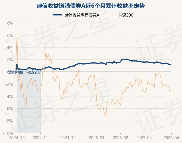 证券之星消息,4月1日,建信收益增强债券A最新单位净值为1.528元,累计净值为1.993元,较前一交易日上涨0.07%。历史数据显示该基金近1个月下跌0.33%,近3个月下跌0.2%,近6个月上涨1.19%,近1年上涨4.23%。该基金近6个月的累计收益率走势如下图: