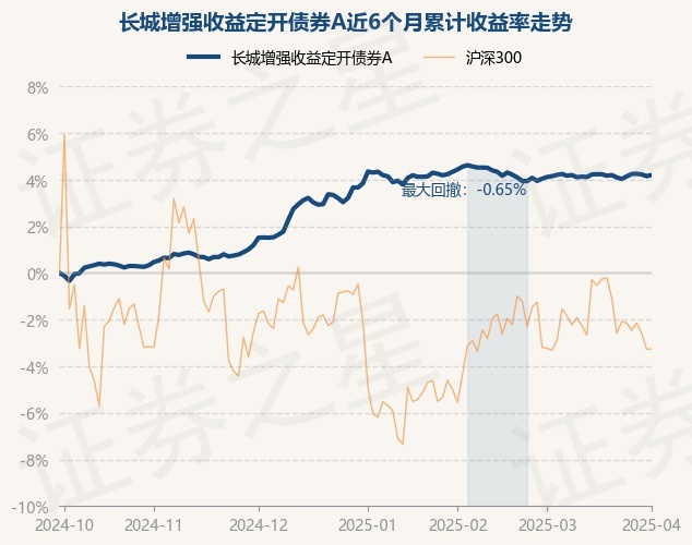证券之星消息,4月1日,长城增强收益定开债券A最新单位净值为1.1285元,累计净值为1.6698元,较前一交易日上涨0.04%。历史数据显示该基金近1个月上涨0.15%,近3个月上涨0.34%,近6个月上涨4.2%,近1年上涨7.16%。该基金近6个月的累计收益率走势如下图: