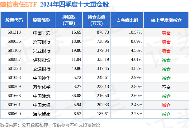 建信责任ETF为指数型-股票基金,根据最新一期基金季报显示,该基金资产配置:股票占净值比98.76%,无债券类资产,现金占净值比1.47%。基金十大重仓股如下: