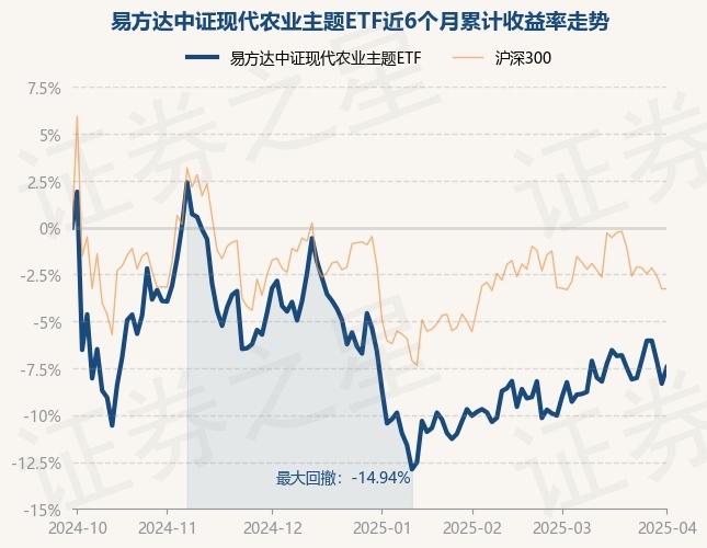证券之星消息,4月1日,易方达中证现代农业主题ETF最新单位净值为0.7136元,累计净值为0.7136元,较前一交易日上涨0.96%。历史数据显示该基金近1个月上涨2.87%,近3个月下跌0.89%,近6个月下跌7.44%,近1年下跌7.38%。该基金近6个月的累计收益率走势如下图: