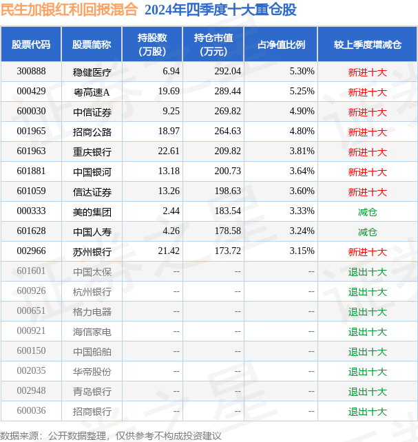 民生加银红利回报混合为混合型-灵活基金,根据最新一期基金季报显示,该基金资产配置:股票占净值比79.27%,债券占净值比2.15%,现金占净值比21.27%。基金十大重仓股如下: