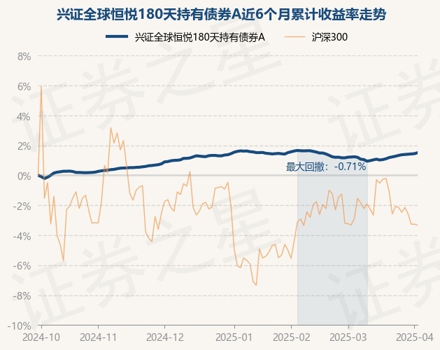 证券之星消息,4月1日,兴证全球恒悦180天持有债券A最新单位净值为1.132元,累计净值为1.132元,较前一交易日上涨0.02%。历史数据显示该基金近1个月上涨0.27%,近3个月上涨0.0%,近6个月上涨1.44%,近1年上涨2.81%。该基金近6个月的累计收益率走势如下图: