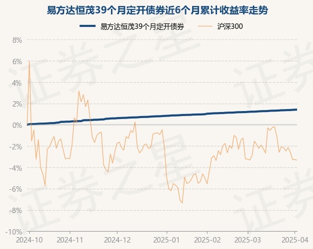 证券之星消息,4月1日,易方达恒茂39个月定开债券最新单位净值为1.0085元,累计净值为1.144元,较前一交易日上涨0.01%。历史数据显示该基金近1个月上涨0.22%,近3个月上涨0.58%,近6个月上涨1.4%,近1年上涨2.67%。该基金近6个月的累计收益率走势如下图: