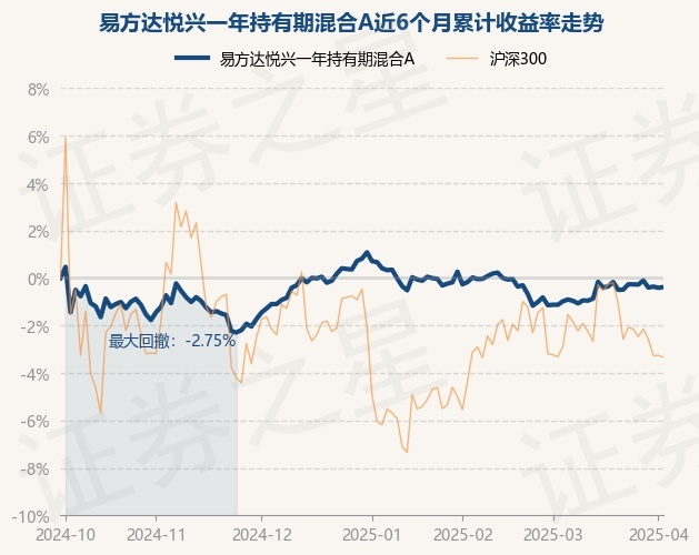 证券之星消息,4月2日,易方达悦兴一年持有期混合A最新单位净值为1.0319元,累计净值为1.0319元,较前一交易日上涨0.03%。历史数据显示该基金近1个月上涨0.77%,近3个月下跌1.08%,近6个月下跌0.39%,近1年上涨4.71%。该基金近6个月的累计收益率走势如下图: