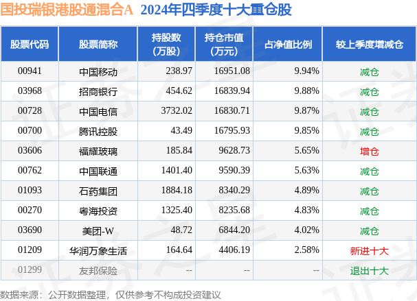 国投瑞银港股通混合A为混合型-偏股基金,根据最新一期基金季报显示,该基金资产配置:股票占净值比93.66%,无债券类资产,现金占净值比6.95%。基金十大重仓股如下: