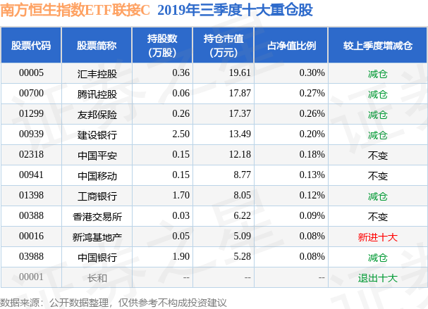 南方恒生指数ETF联接C为指数型-股票基金,根据最新一期基金季报显示,该基金资产配置:无股票类资产,债券占净值比3.86%,现金占净值比2.77%。基金十大重仓股如下:
