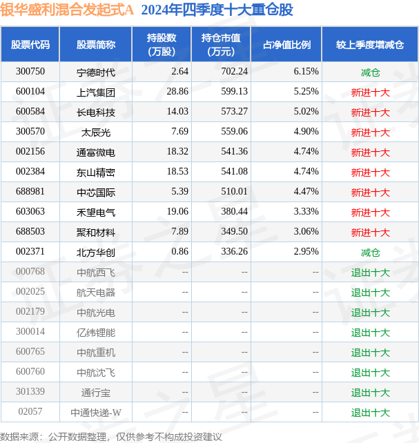 银华盛利混合发起式A为混合型-偏股基金,根据最新一期基金季报显示,该基金资产配置:股票占净值比87.15%,无债券类资产,现金占净值比11.17%。基金十大重仓股如下: