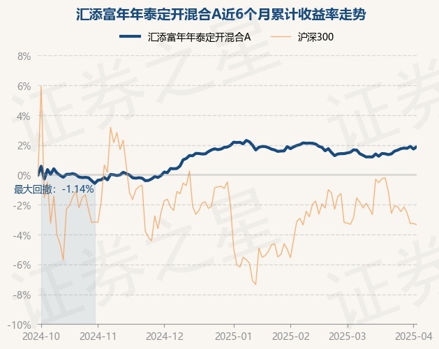 证券之星消息,4月2日,汇添富年年泰定开混合A最新单位净值为1.2883元,累计净值为1.2883元,较前一交易日上涨0.15%。历史数据显示该基金近1个月上涨0.45%,近3个月下跌0.3%,近6个月上涨1.87%,近1年上涨4.51%。该基金近6个月的累计收益率走势如下图: