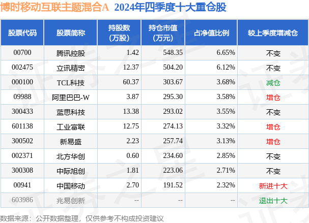博时移动互联主题混合A为混合型-偏股基金,根据最新一期基金季报显示,该基金资产配置:股票占净值比80.5%,无债券类资产,现金占净值比19.28%。基金十大重仓股如下: