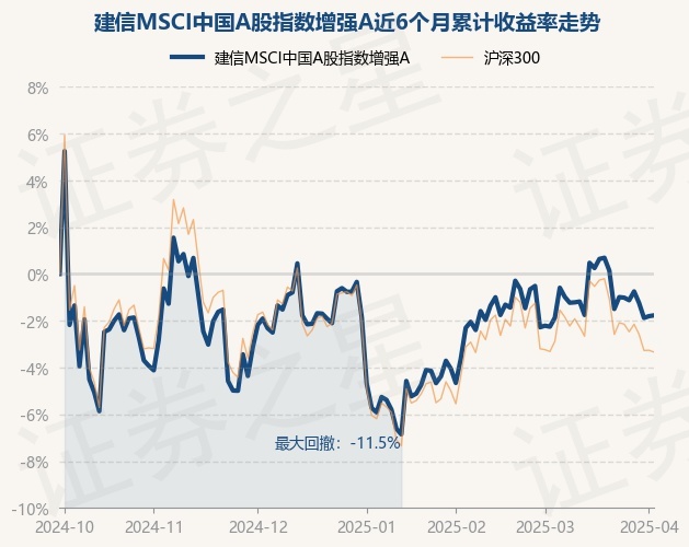 证券之星消息,4月2日,建信MSCI中国A股指数增强A最新单位净值为1.1807元,累计净值为1.4417元,较前一交易日上涨0.03%。历史数据显示该基金近1个月上涨0.52%,近3个月上涨3.05%,近6个月下跌1.77%,近1年上涨10.02%。该基金近6个月的累计收益率走势如下图: