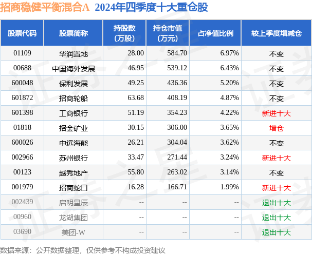 招商稳健平衡混合A为混合型-平衡基金,根据最新一期基金季报显示,该基金资产配置:股票占净值比69.5%,债券占净值比17.71%,现金占净值比13.79%。基金十大重仓股如下: