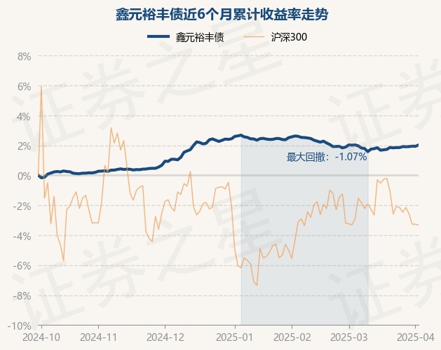 证券之星消息,4月2日,鑫元裕丰债最新单位净值为1.097元,累计净值为1.107元,较前一交易日上涨0.08%。历史数据显示该基金近1个月上涨0.13%,近3个月下跌0.56%,近6个月上涨2.02%,近1年上涨3.89%。该基金近6个月的累计收益率走势如下图: