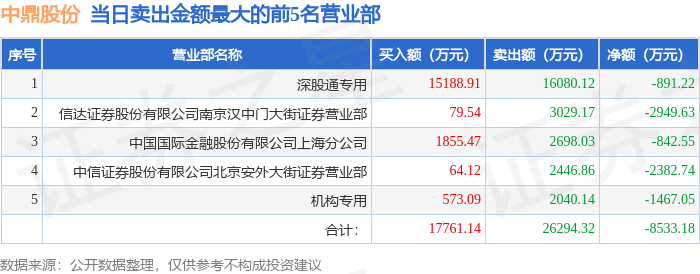 证券之星消息,沪深交易所2025年4月8日公布的交易公开信息显示,中鼎股份(000887)因日跌幅偏离值达到7%的前5只证券登上龙虎榜。此次是近5个交易日内第1次上榜。