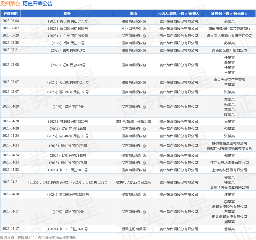 案号:(2024)粤0305民初25268号根据统计,近一年内以贵州茅台酒股份有限公司为当事人的历史开庭公告有292则,其中案由为“侵害商标权纠纷”的公告以229则居首,其次为“商标权权属、侵权纠纷”有20则,“假冒注册商标罪”有9则。历史开庭公告(前20条)如下: