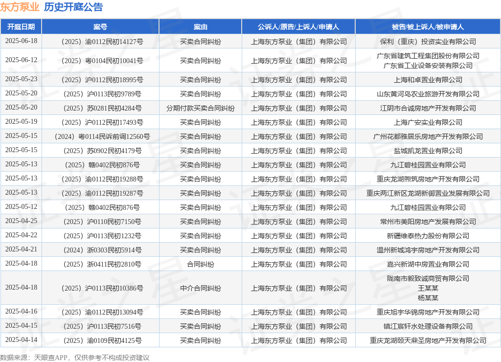 案号:(2025)沪0113民初10386号根据统计,近一年内以上海东方泵业(集团)有限公司为当事人的历史开庭公告有294则,其中案由为“买卖合同纠纷”的公告以270则居首,其次为“合同纠纷”有13则,“分期付款买卖合同纠纷”有2则。历史开庭公告(前20条)如下:
