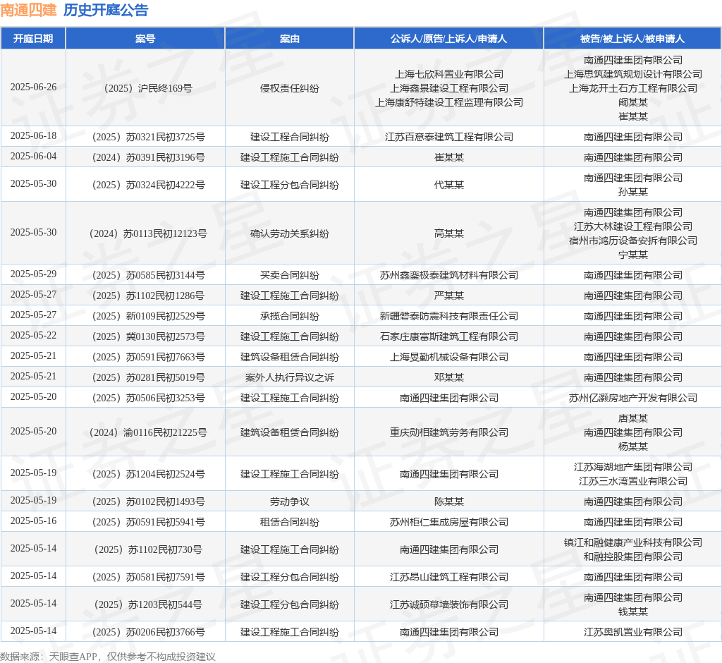 案号:(2025)闽0121民初354号根据统计,近一年内以南通四建集团有限公司为当事人的历史开庭公告有770则,其中案由为“建设工程施工合同纠纷”的公告以235则居首,其次为“买卖合同纠纷”有188则,“建设工程分包合同纠纷”有58则。历史开庭公告(前20条)如下: