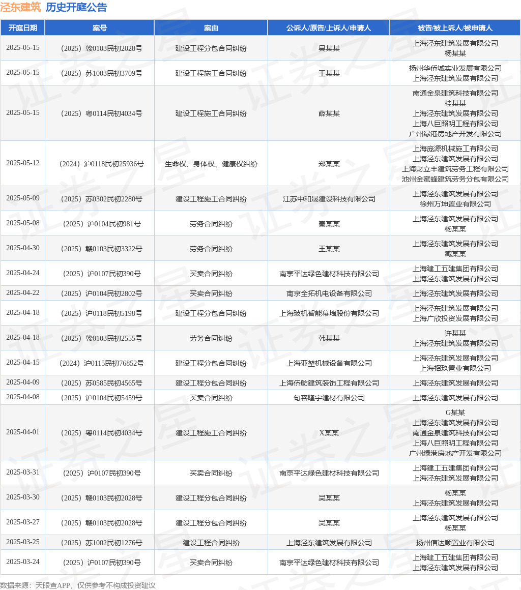 案号:(2025)沪0118民初5198号根据统计,近一年内以上海泾东建筑发展有限公司为当事人的历史开庭公告有112则,其中案由为“买卖合同纠纷”的公告以27则居首,其次为“劳务合同纠纷”有19则,“建设工程分包合同纠纷”有14则。历史开庭公告(前20条)如下: