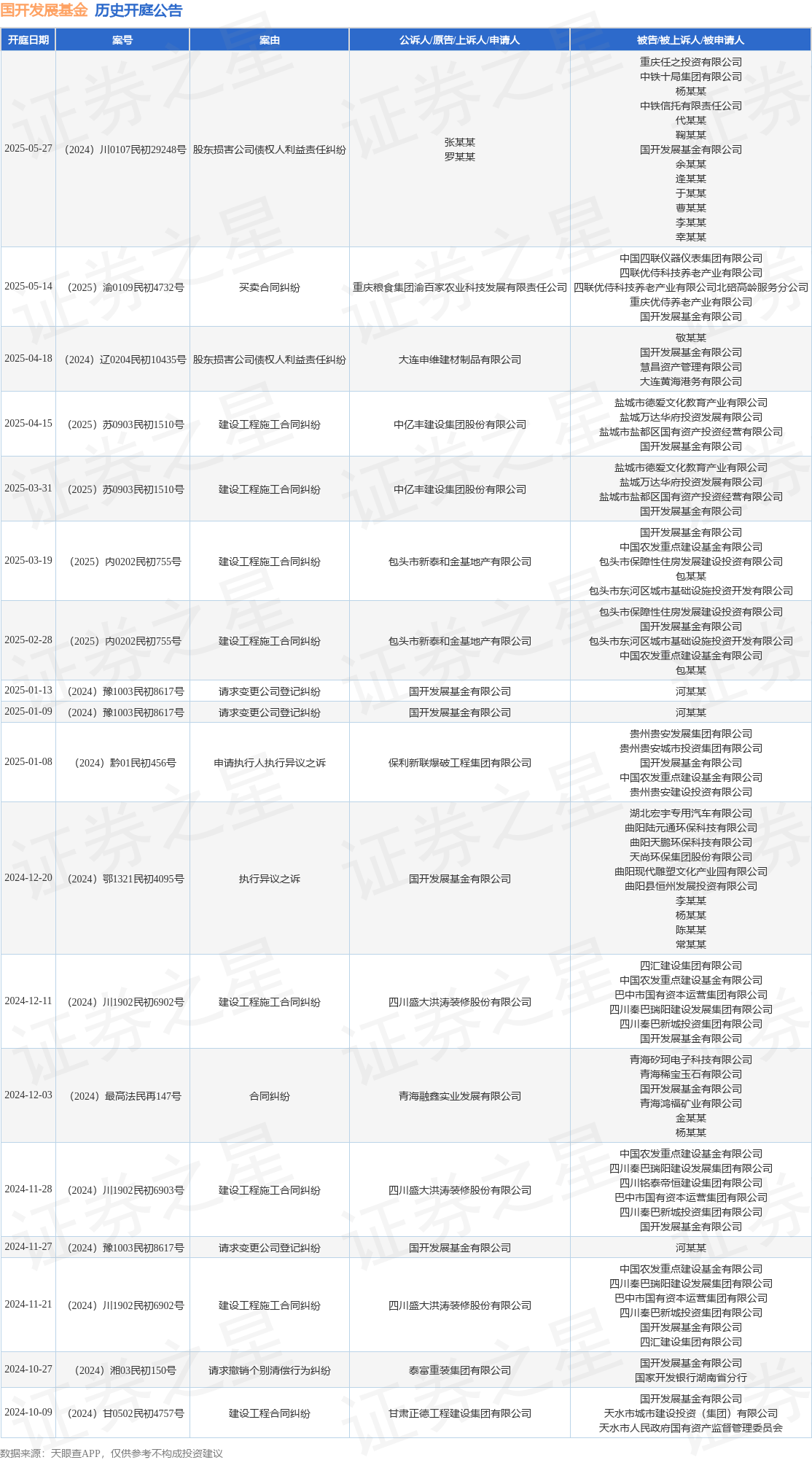 案号:(2024)辽0204民初10435号根据统计,近一年内以国开发展基金有限公司为当事人的历史开庭公告有18则,其中案由为“建设工程施工合同纠纷”的公告以7则居首,其次为“请求变更公司登记纠纷”有3则,“股东损害公司债权人利益责任纠纷”有2则。历史开庭公告如下: