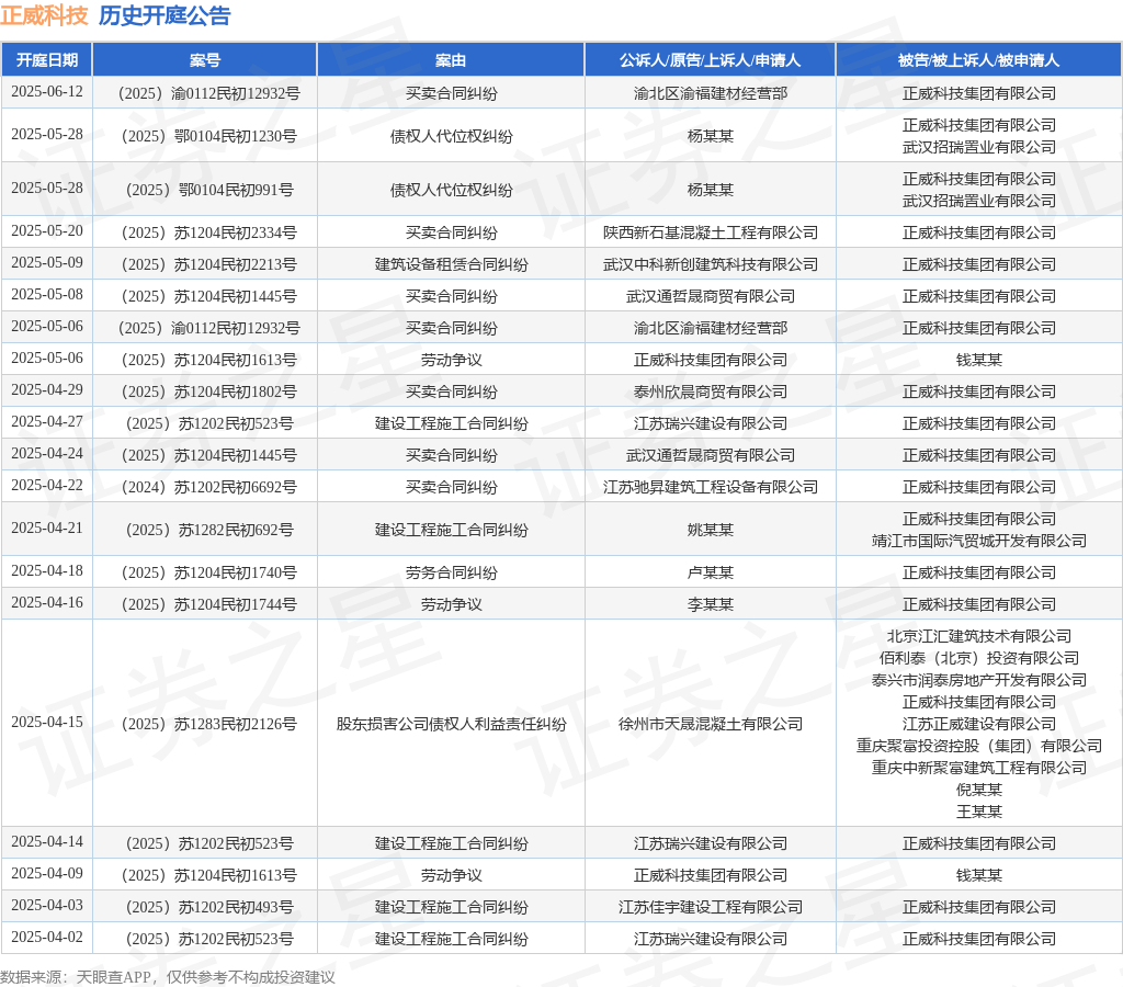 案号:(2025)苏1204民初1740号根据统计,近一年内以正威科技集团有限公司为当事人的历史开庭公告有138则,其中案由为“买卖合同纠纷”的公告以40则居首,其次为“建设工程施工合同纠纷”有23则,“建设工程分包合同纠纷”有14则。历史开庭公告(前20条)如下: