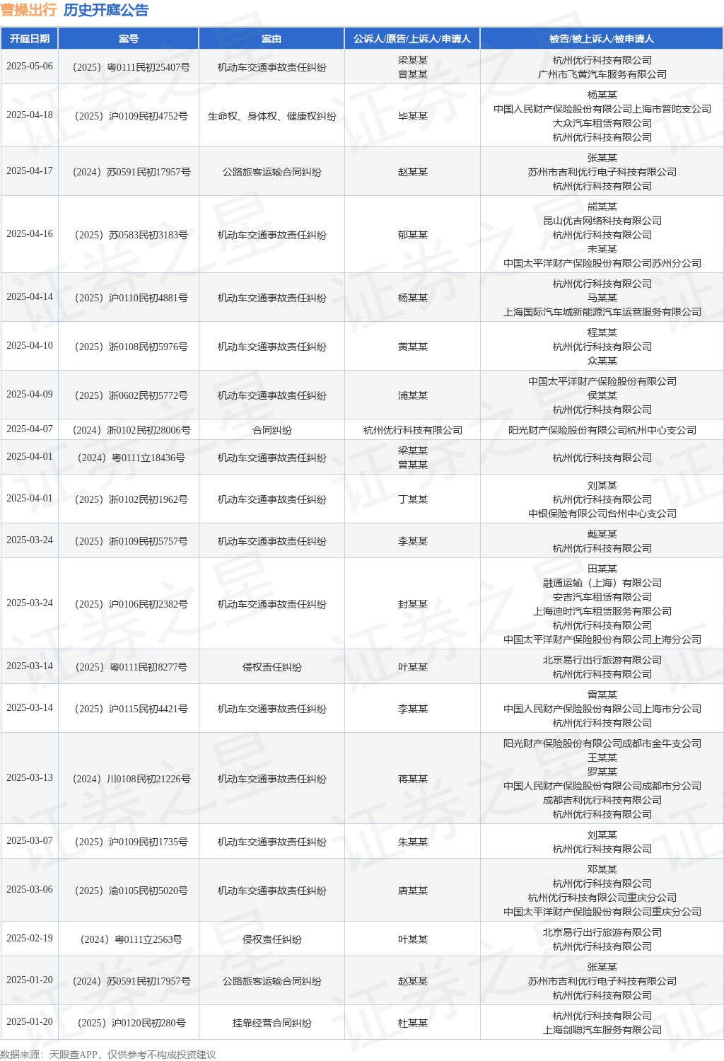 案号:(2025)沪0109民初4752号根据统计,近一年内以杭州优行科技有限公司为当事人的历史开庭公告有53则,其中案由为“机动车交通事故责任纠纷”的公告以35则居首,其次为“侵害商标权纠纷”有2则,“侵权责任纠纷”有2则。历史开庭公告(前20条)如下: