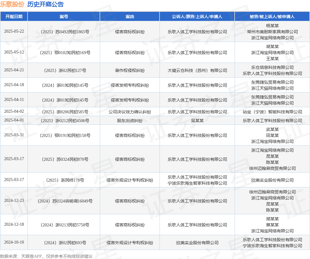 证券之星消息,根据天眼查APP显示,近日公布了一则乐歌人体工学科技股份有限公司作为原告/上诉人的开庭公告,详细内容如下: