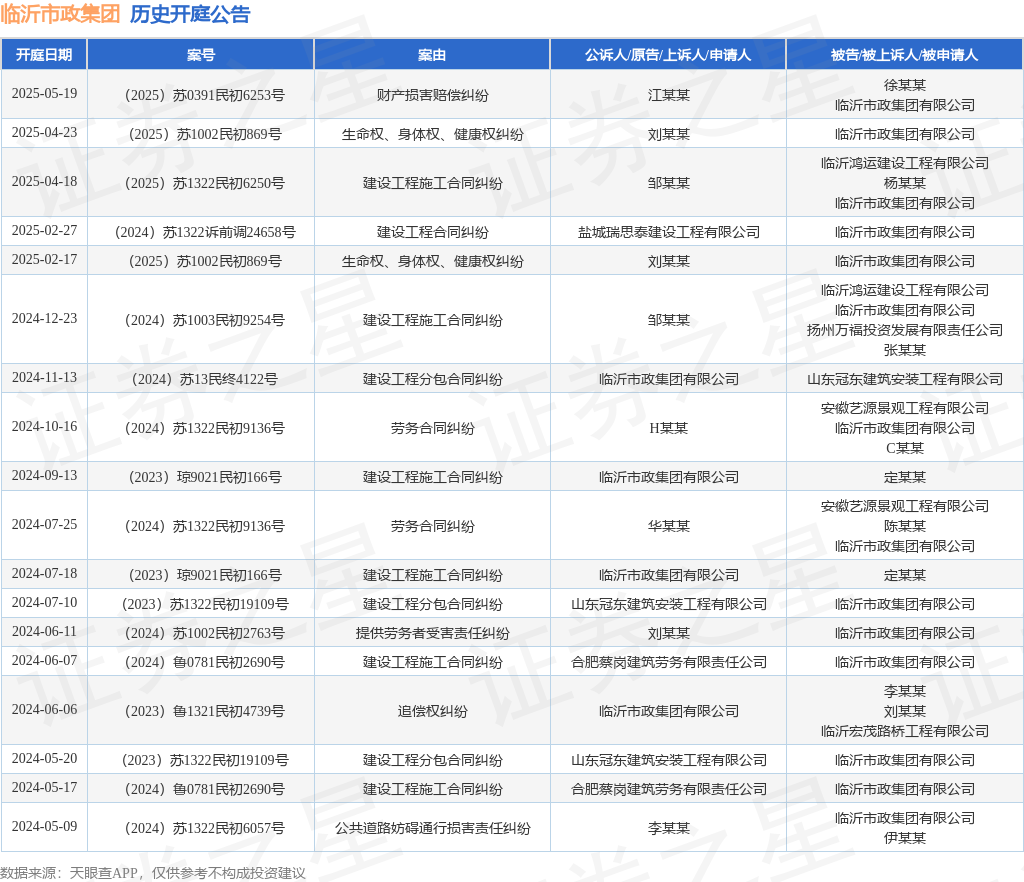 案号:(2025)苏1322民初6250号根据统计,近一年内以临沂市政集团有限公司为当事人的历史开庭公告有18则,其中案由为“建设工程施工合同纠纷”的公告以6则居首,其次为“建设工程分包合同纠纷”有3则,“劳务合同纠纷”有2则。历史开庭公告如下: