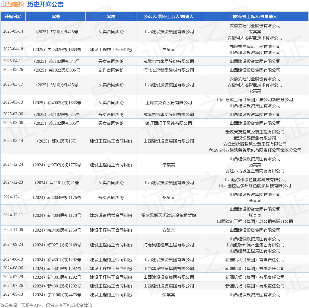 案号:(2025)内2502民初1663号根据统计,近一年内以山西建设投资集团有限公司为当事人的历史开庭公告有22则,其中案由为“建设工程施工合同纠纷”的公告以11则居首,其次为“买卖合同纠纷”有8则,“定作合同纠纷”有1则。历史开庭公告(前20条)如下: