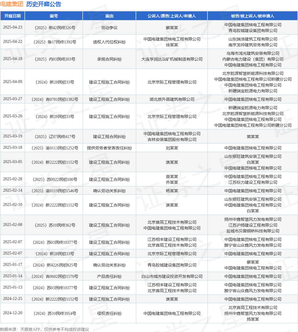 案号:(2025)内03民终203号根据统计,近一年内以中国电建集团核电工程有限公司为当事人的历史开庭公告有62则,其中案由为“建设工程施工合同纠纷”的公告以28则居首,其次为“建设工程合同纠纷”有7则,“借款合同纠纷”有5则。历史开庭公告(前20条)如下: