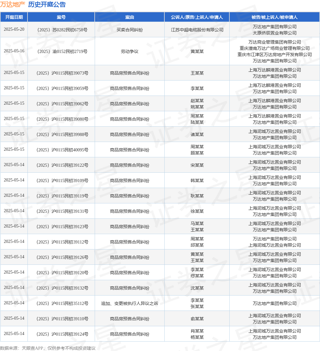 案号:(2025)沪0115民初23145号根据统计,近一年内以万达地产集团有限公司为当事人的历史开庭公告有679则,其中案由为“商品房预售合同纠纷”的公告以440则居首,其次为“票据追索权纠纷”有39则,“建设工程施工合同纠纷”有34则。历史开庭公告(前20条)如下: