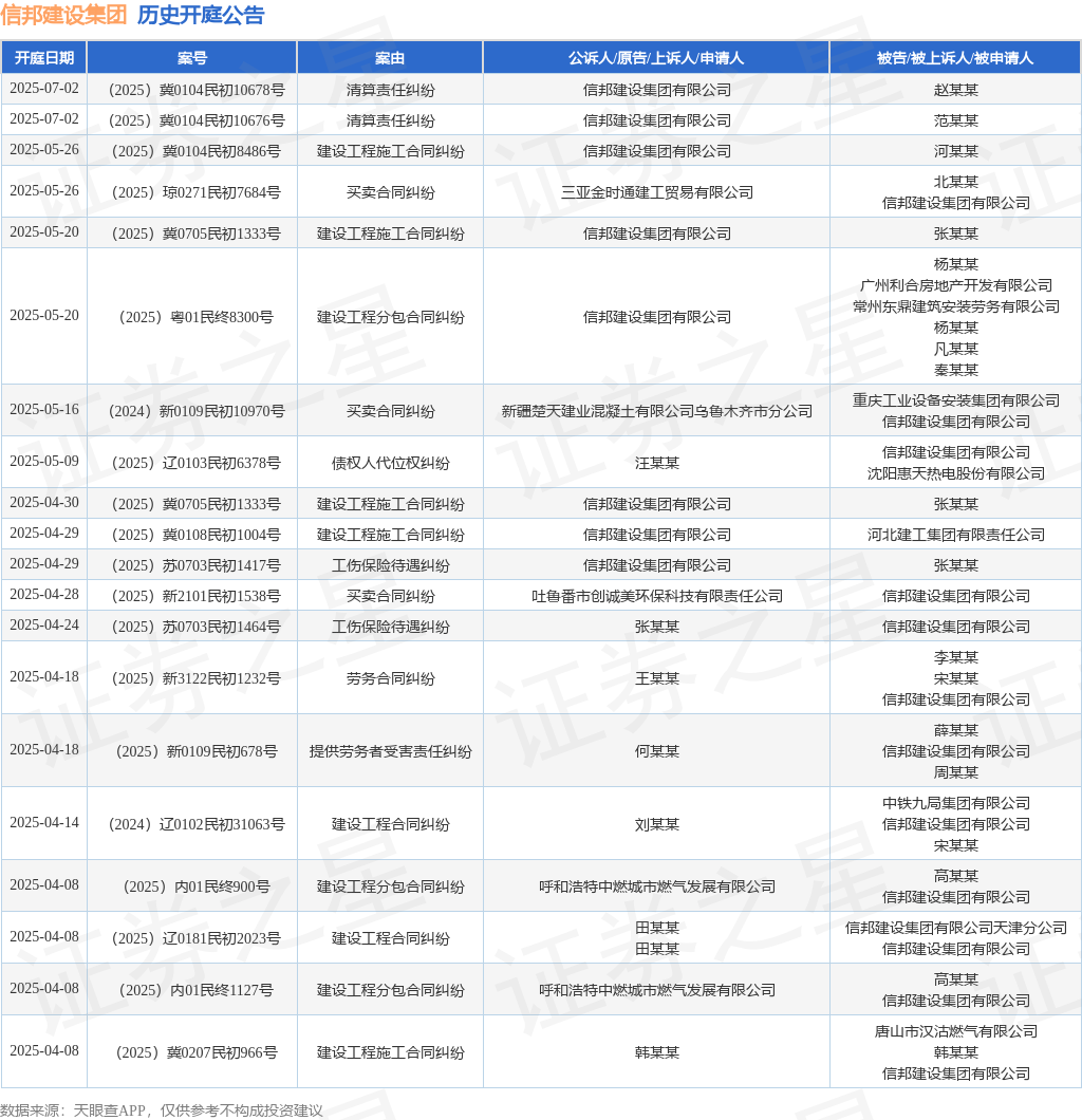 案号:(2025)新3122民初1232号根据统计,近一年内以信邦建设集团有限公司为当事人的历史开庭公告有116则,其中案由为“建设工程施工合同纠纷”的公告以34则居首,其次为“买卖合同纠纷”有17则,“建设工程分包合同纠纷”有14则。历史开庭公告(前20条)如下: