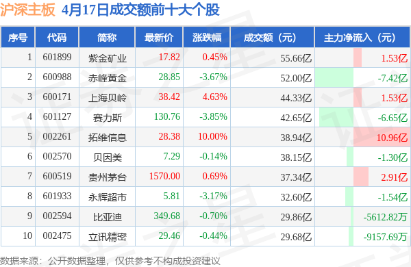当日沪深主板成交额前10大个股中4只个股收涨,平均涨幅3.94%,其中紫金矿业(601899)以成交额55.66亿元排第一。从主力资金流入看,成交额前10大个股中有4只个股呈现主力资金净流入。