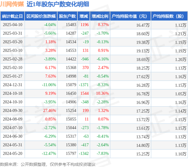 从股价来看,2025年3月31日至2025年4月10日,川网传媒区间跌幅为4.04%,在此期间股东户数增加1196.0户,增幅为8.37%。