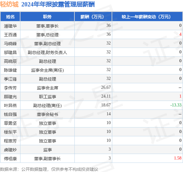 证券之星消息,轻纺城发布2024年年报,数据显示:公司主营收入9.5亿元,同比增11.1%。归母净利润为1.41亿元,同比减34.32%。扣非净利润为1.22亿元,同比减41.04%。当年公司员工总数940人,同比增10.72%。人均薪酬29.38万元(注:"人均薪酬"根据定期报告中"应付职工薪酬"附注的本期增加值 / 员工总数计算而来),同比增6.23%。人均创收101.03万元,同比增0.34%。人均创利15.84万元,同比减40.89%。其中管理层薪酬总额为351.45万元,同比上一年增10.68%,薪酬最高的为董事,董事长潘建华,薪酬36.0万元。