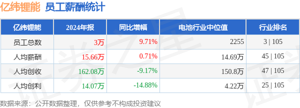 证券之星消息,4月18日亿纬锂能公布2024年年报,当年营收486.15亿元,同比减0.35%;净利润为40.76亿元,同比增0.63%。根据财报数据披露,当年公司员工总数29994人,同比增9.71%;人均薪酬15.66万元,同比增0.71%;人均创收162.08万元,同比减9.17%;人均创利14.07万元,同比减14.88%;公司员工薪酬统计见下表: